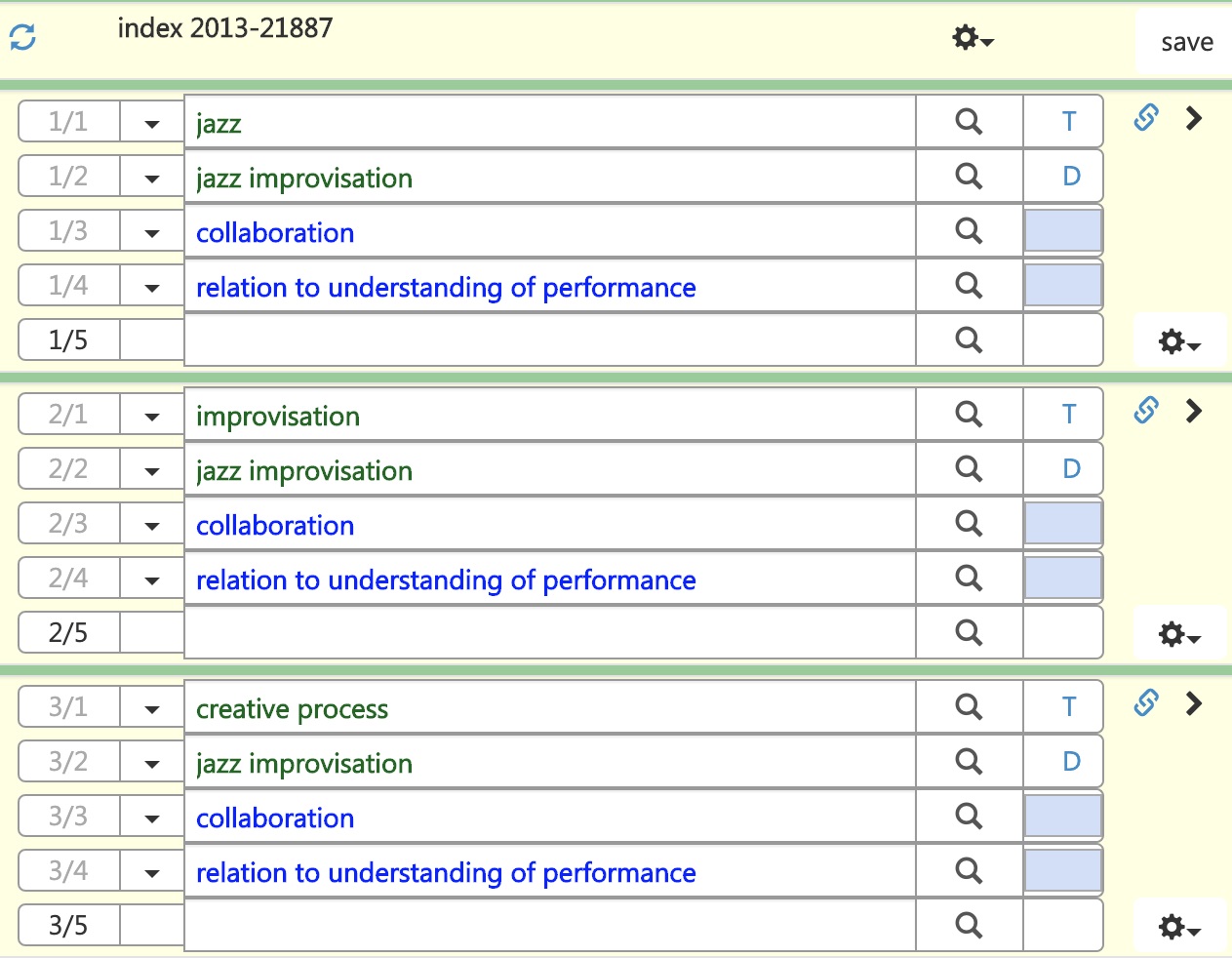 Of the three key thesaurus relationships interlinking terms and concepts (Dextre Clarke 2019), IBIS currently supports the creation of the equivalent relationship between index terms and a one-level hierarchical relationship between headwords and Z terms. Although IBIS allows creating topic IDs and linking equivalent terms to the same topic IDs, RILM editors rarely articulate, curate, or maintain equivalent relationships between terms and constantly add new index terms representing topics already existing in the Index. As shown in the previous example, performers--piano is a verified concept with a topic ID, while the same concept expressed in a more natural form pianists is a null term, not linked to that topic ID. The heavy use of such null terms has contributed to the challenge of improving the recall of RILM Index.